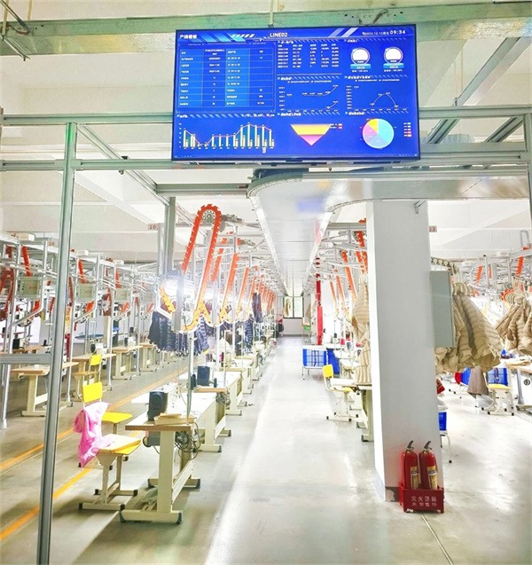 数字赋能,透明管理:华瑞可视化看板系统实时呈现车间产量效率、订单进度、产线状况、问题点及员工绩效等关键数据,实现了“从一根纱线到成品”的全链路数字化、透明化管理。
